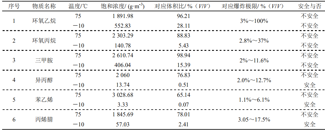 表1不同溫度下有機物飽和濃度安全性分析